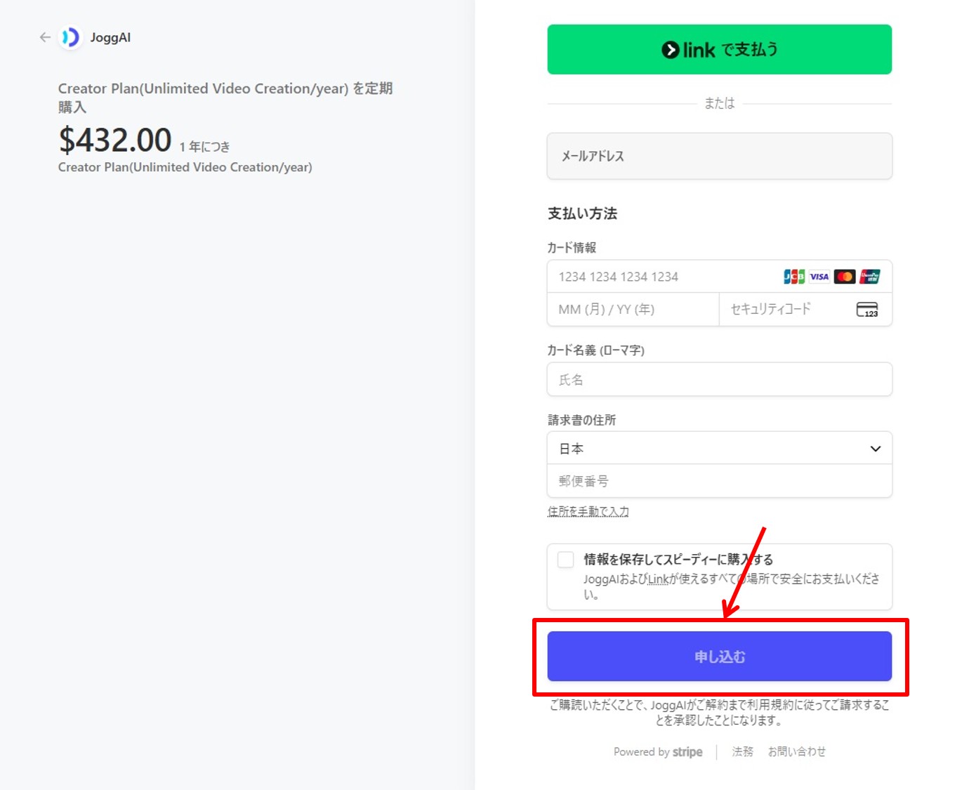 情報を入力したら申し込みをします。