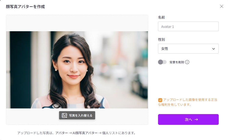 作成画面に移動したらアバターとして使用したい静止画(写真)をアップロードします。