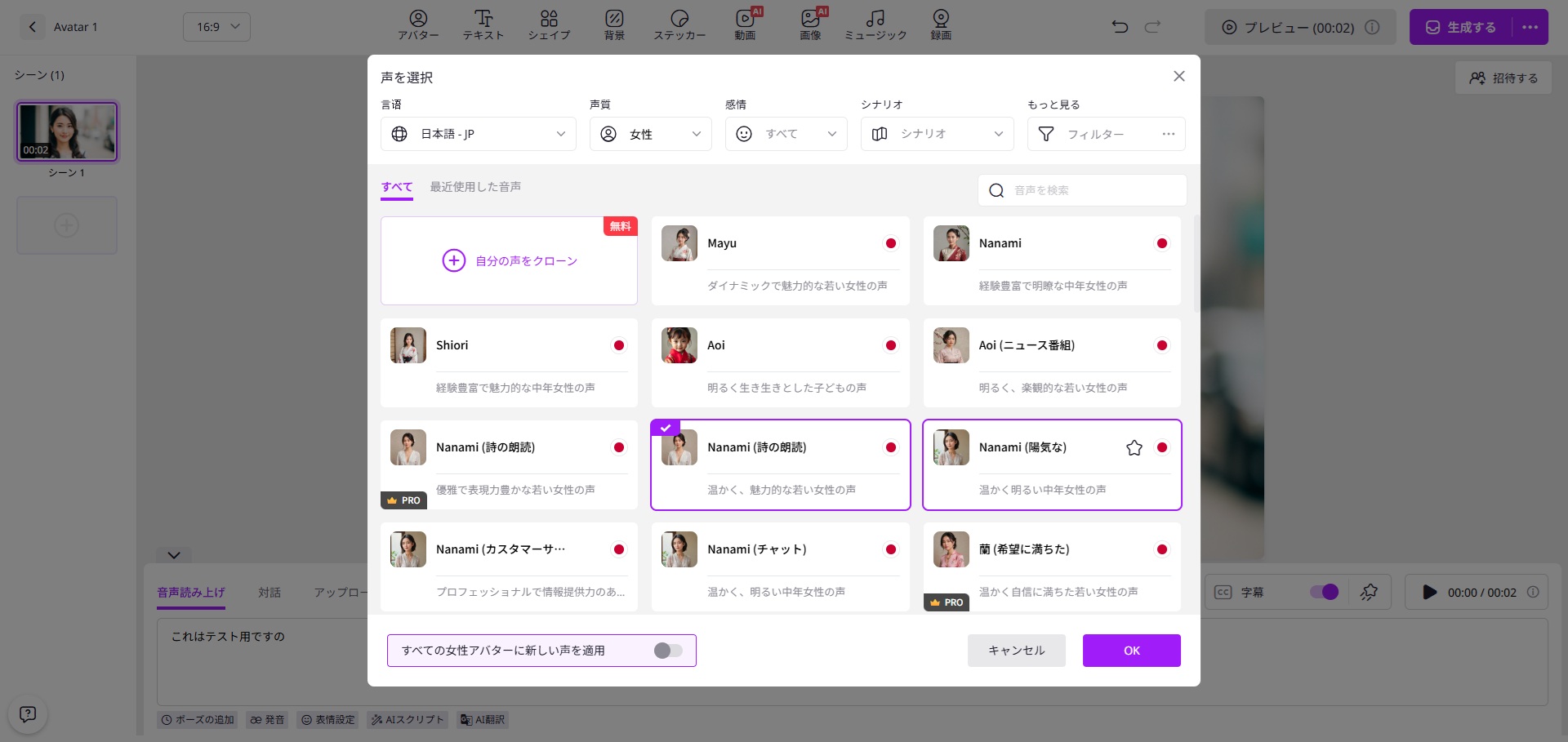 Vidnozは日本語のAI音声にも対応しており、イントネーション調整も可能です。