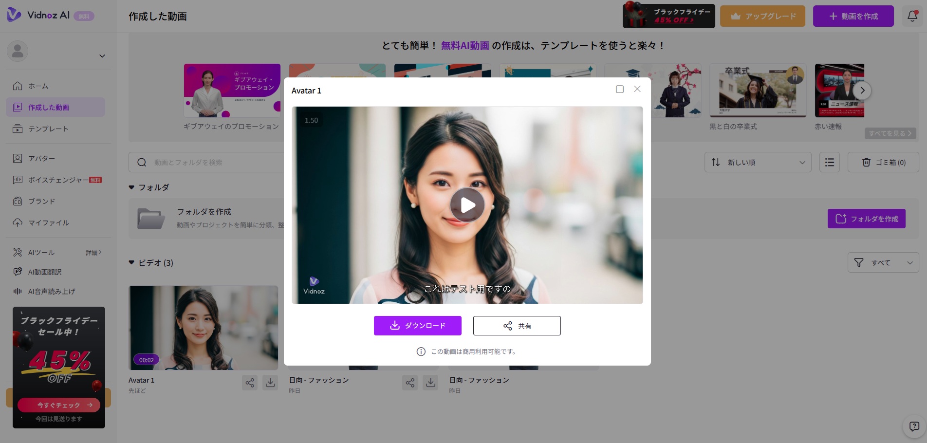 完成した動画を確認し、問題なければ「ダウンロード」をクリックして動画を保存します。