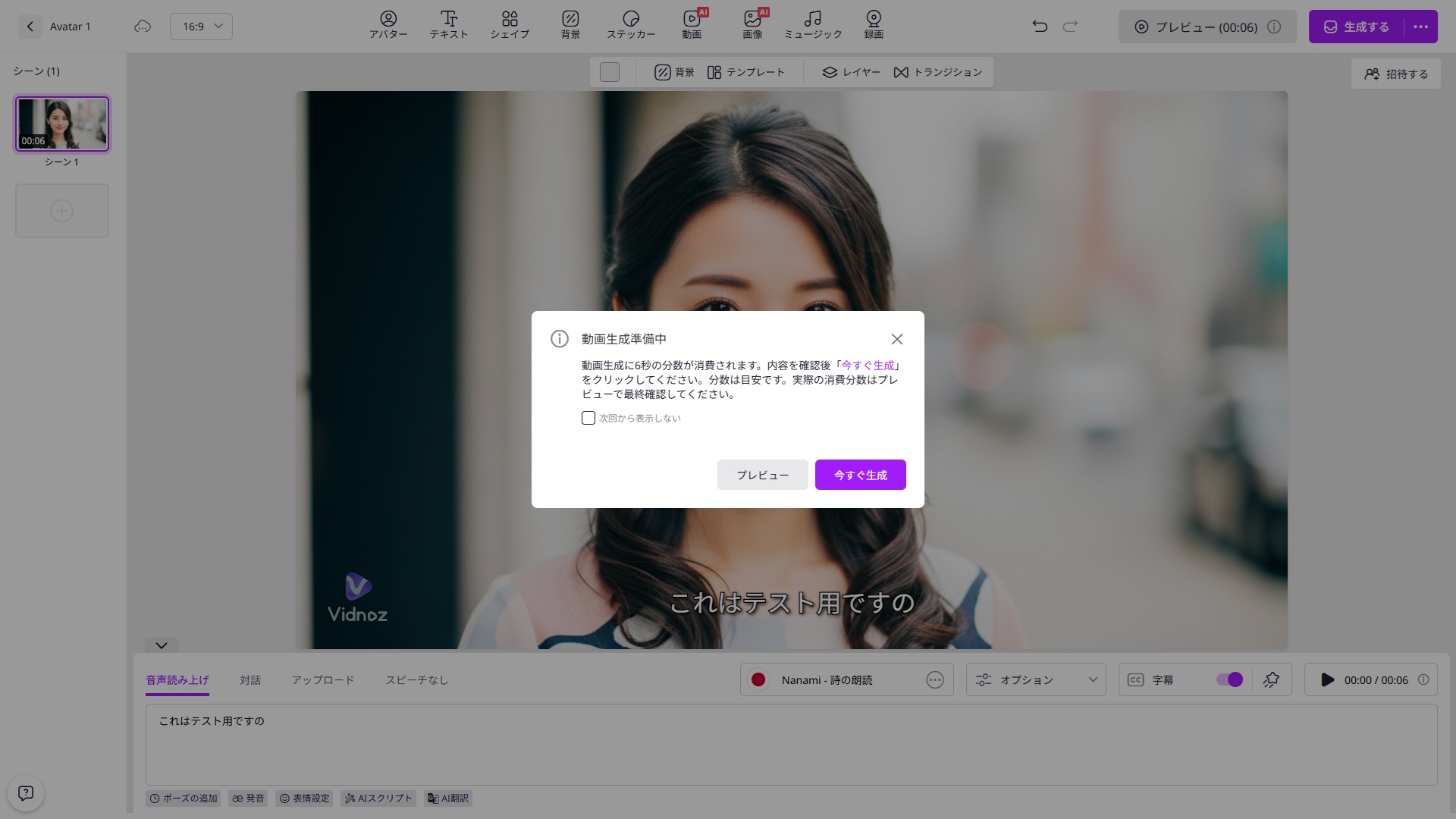 テキスト入力と設定が完了したら「生成する」をクリックし「今すぐ生成」をクリックします。