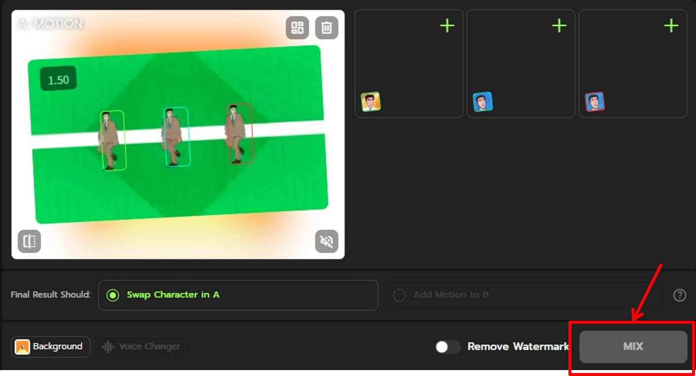 キャラクター画像と踊らせたいダンスが決まったら「MIX」をクリックします。