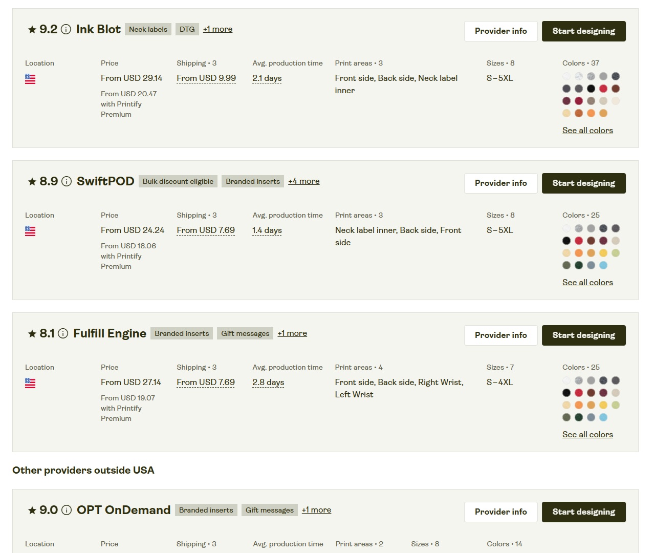 Printifyの素晴らしい点は世界中の印刷業者(プリントプロバイダー)と提携しており、同じTシャツでも複数の業者から選べることです。