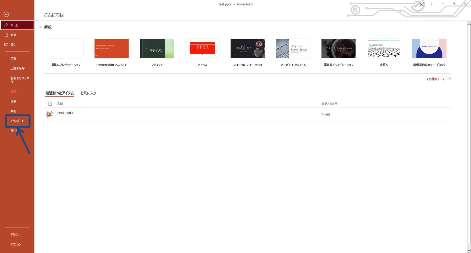 メニューバーの「ファイル」から「エクスポート」を選びます。