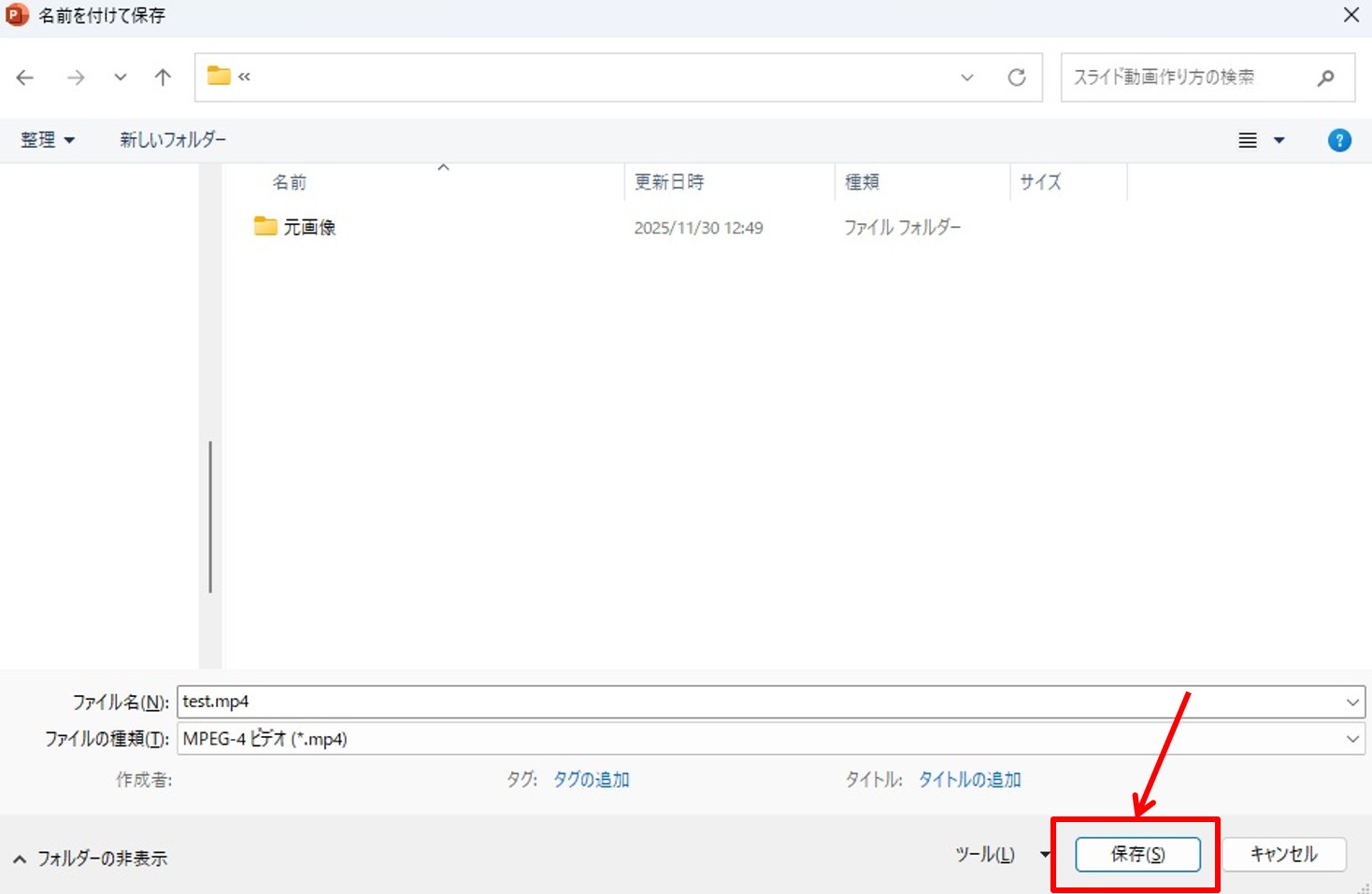 ファイルの種類が「MPEG-4 ビデオ (*.mp4)」になっていることを確認してください。