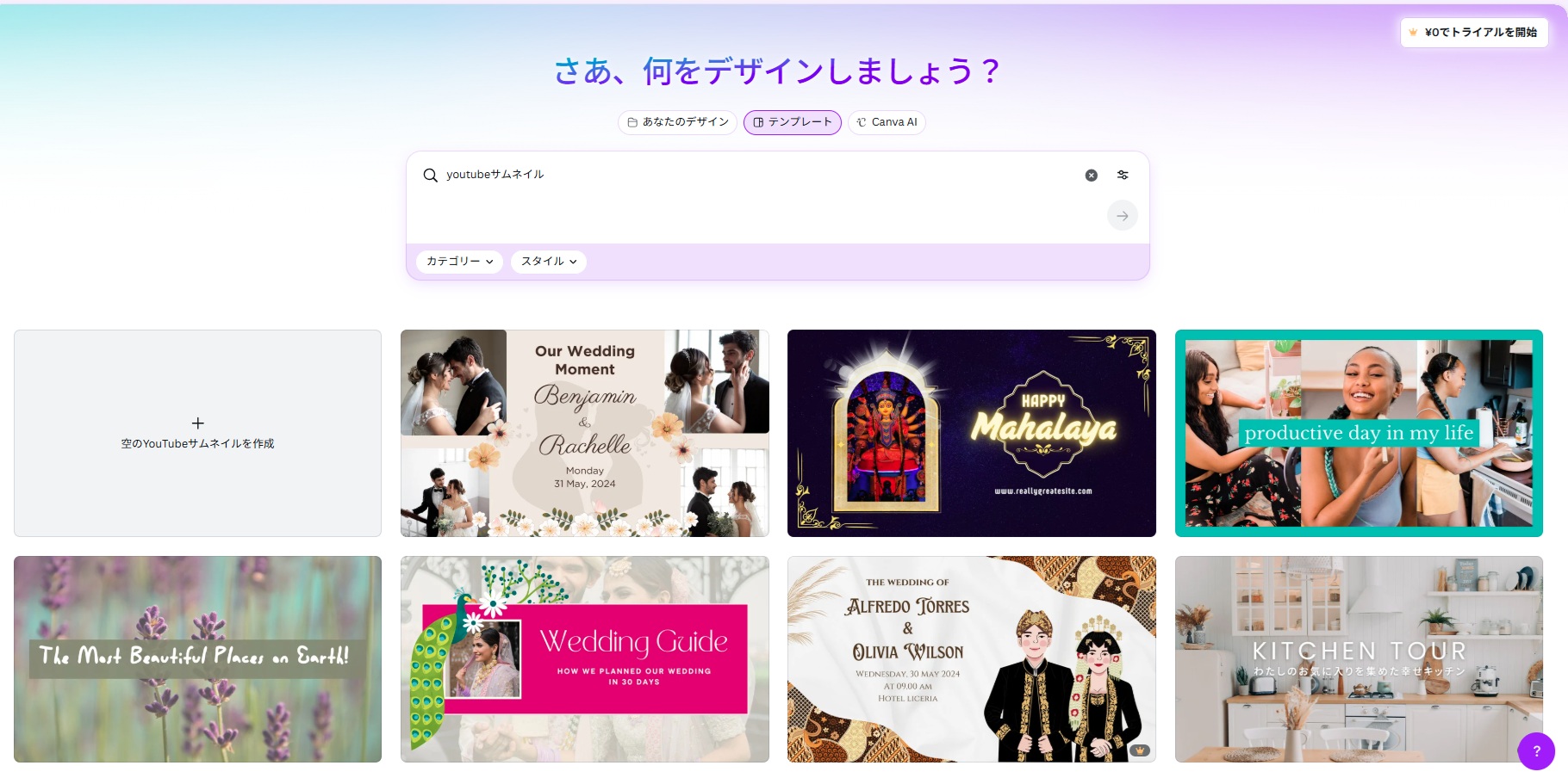 CanvaにはあらかじめYouTubeサムネイルというテンプレートが用意されています。