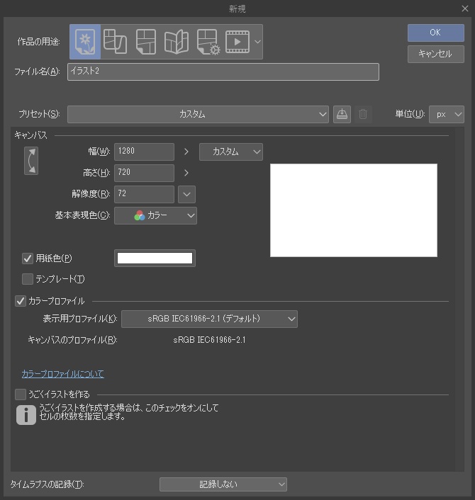幅1280、高さ720と入力し、解像度は72dpiに設定します。