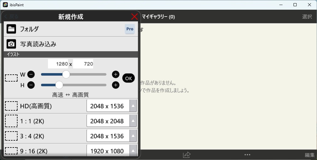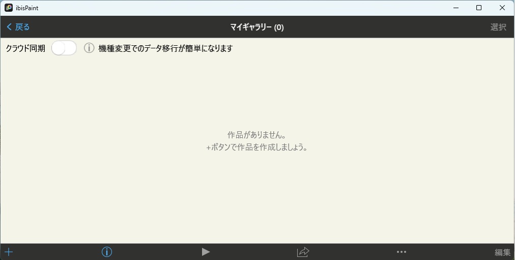 アプリを開き、「マイギャラリー」から「+」を押して新規キャンバスを作成します。