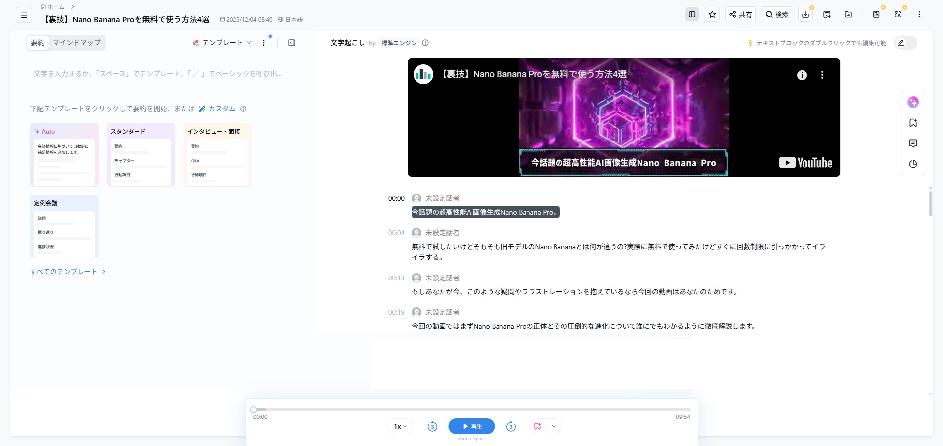 その中にあるボタンをクリックすると瞬時に文字起こしが始まります。