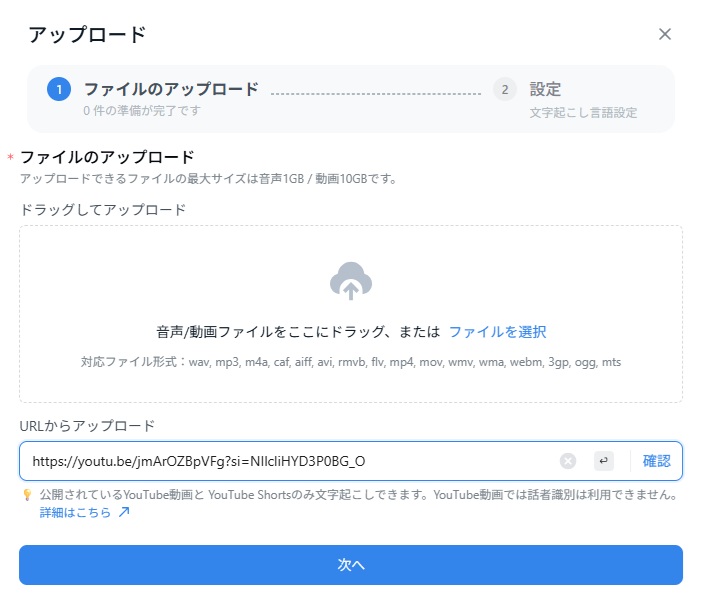 「URLからアップロード」を選びYouTube動画のリンクを貼り付けます。