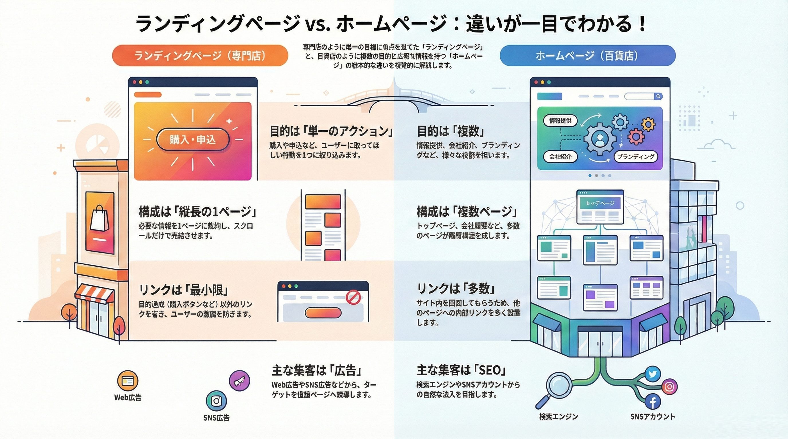 | 目的 | 購入・申込など1つのアクションに絞られる | 情報提供、ブランディングなど複数の目的を持つ |